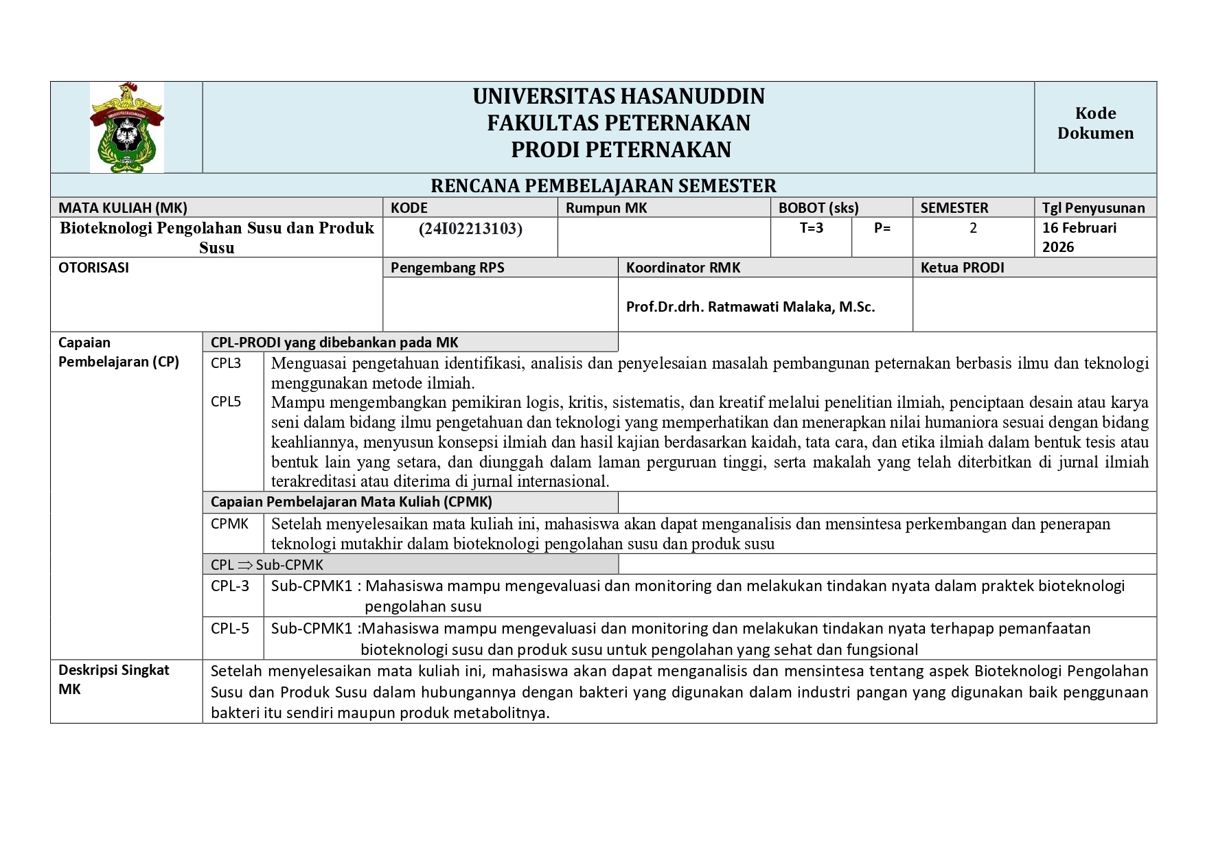 BIOTEKNOLOGI PENGOLAHAN SUSU DAN PRODUK SUSU [24I02213103]